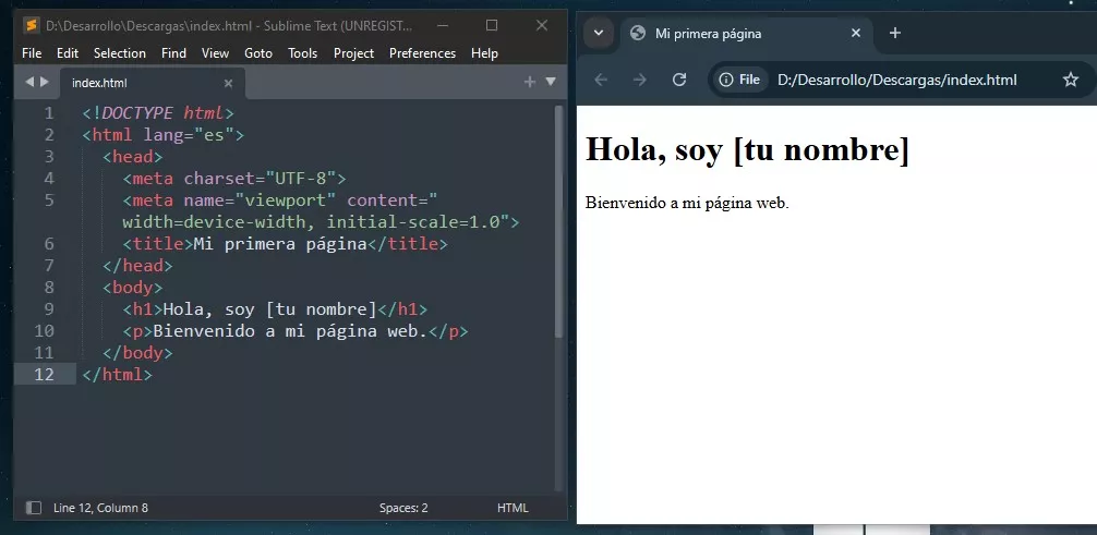 Puedes copiar ese bloque, pegarlo en el bloc de notas y guardarlo como index.html. Luego ábrelo en tu navegador arrastrándolo a la ventana — ya tienes tu primera página web funcionando en local.