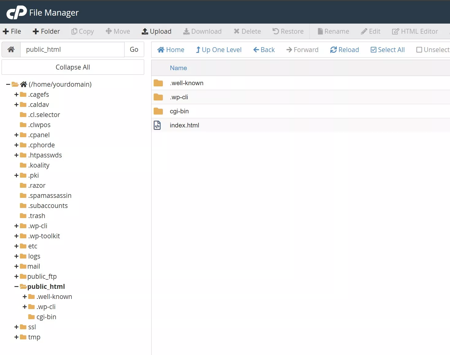 cPanel es el panel de control que la mayoría de los hostings compartidos incluyen. Tiene una interfaz visual para manejar tus archivos sin instalar nada.